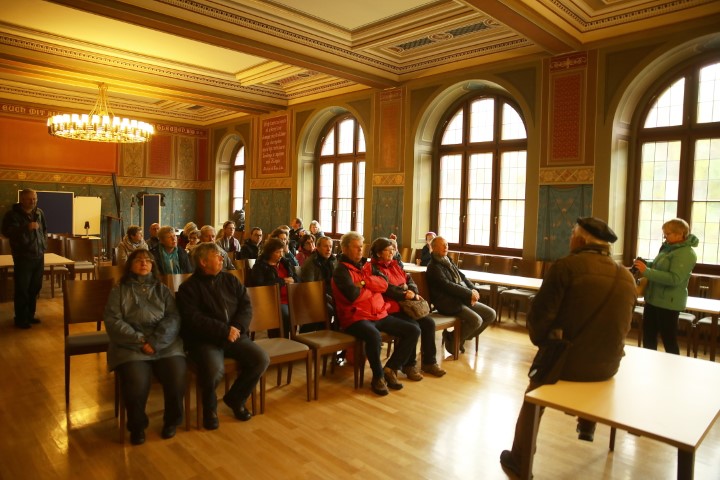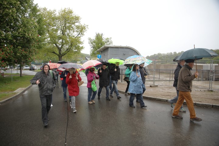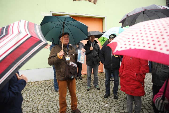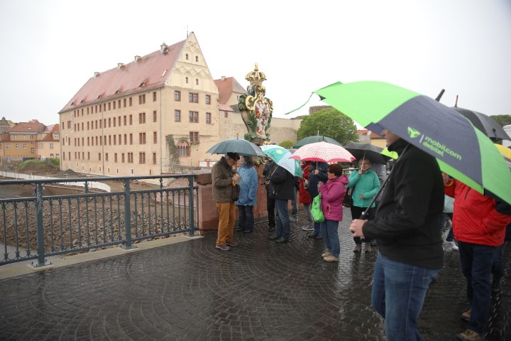 Temperaturen, die gefühlt am Gefrierpunkt lagen, tatsächlich war es etwas wärmer und Regenschirme prägten das Bild am Volkshausplatz in Grimma am Vormittag des 4. Mai 2019. Getreu dem Motto: „Es gibt kein schlechtes Wetter, es gibt nur schlechte Kleidung“ ließen es sich 60 Unverdrossene nicht nehmen und starteten in zwei Gruppen zur Stadtführung unter Leitung von Herrn Büchner und Herrn Voigtländer von der Stadtinformation Grimma. Mit viel Sachkenntnis und Enthusiasmus zeigten sie uns ihre Stadt, gaben Wissenswertes zur älteren und jüngeren Geschichte preis und hinterließen bei so manchem den Wunsch, noch einmal wiederzukommen. Geblieben ist der Eindruck einer vom Hochwasser gebeutelten und mit viel Kraft wunderschön wiederauferstandenen Stadt.